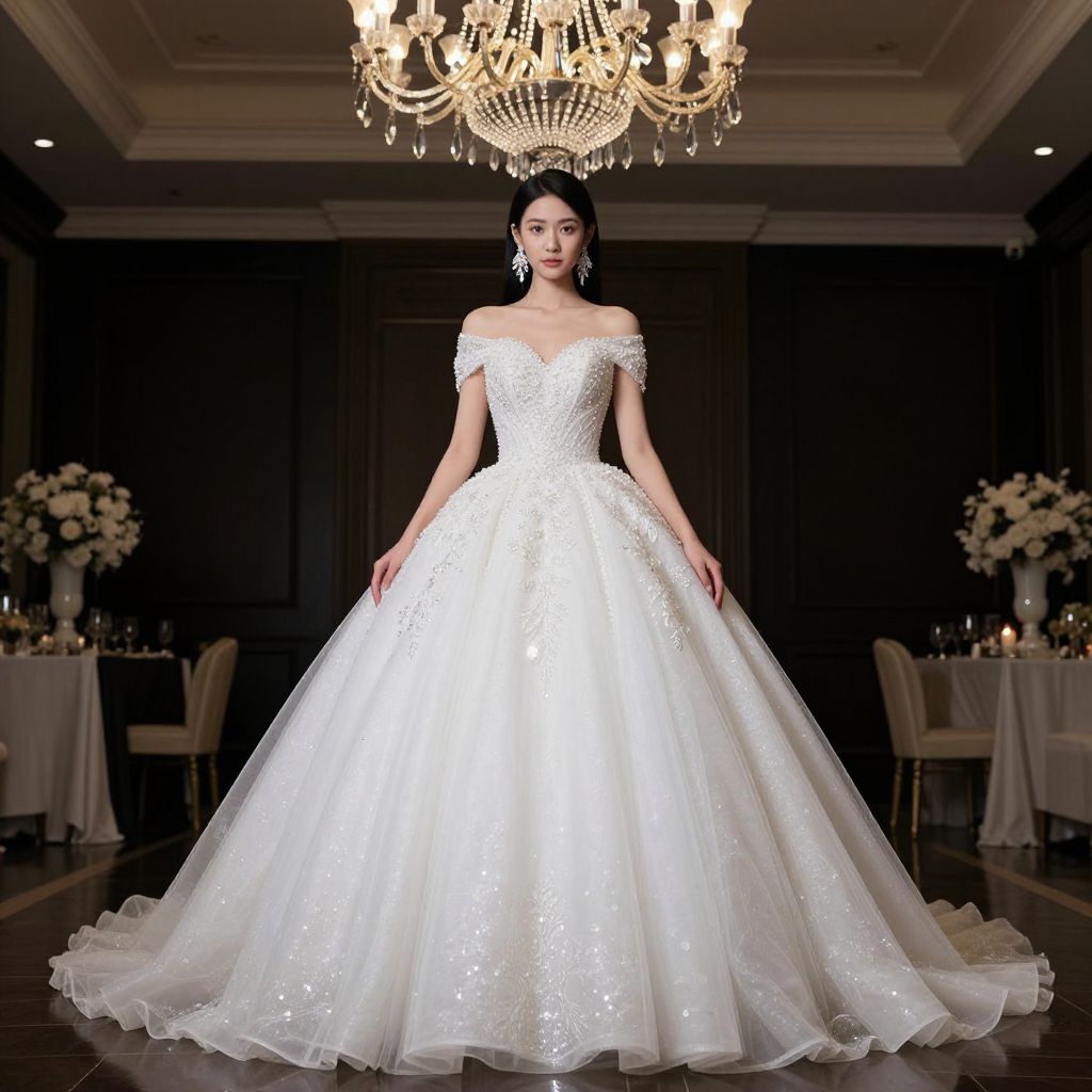 Photograph of a slender, light-skinned woman with long black hair, wearing an off-the-shoulder, white, lace-embellished ball gown with a full, sparkling tulle skirt. She stands confidently in an elegant, dimly lit ballroom with a grand chandelier overhead. The background features dark walls, round tables draped in white cloths, and floral centerpieces. The woman's makeup is subtle, with red lipstick, and she wears large, dangling earrings. The floor is reflective, enhancing the gown's shimmering details.