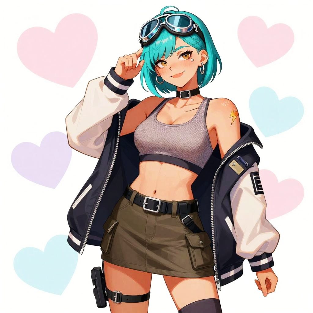 An anime style illustration of a confident athletic young woman with a short teal undercut and shaved side, sun-kissed skin and faint freckles, big breasts, wearing an asymmetric zip-up varsity jacket left open over a cropped mesh sports bra, high-waisted cargo mini skirt with a utility belt, thigh-high athletic socks and chunky sneakers, and goggles resting on her forehead, silver hoop eyebrow piercing, small lightning bolt tattoo on her collarbone. She has hazel eyes with a confident, cheeky smirk. The background is decorated with pastel hearts in shades of pink, lavender, and light blue. The artwork is colorful, vibrant, featuring soft shading and smooth line art, capturing a cute, friendly, and lively atmosphere.
