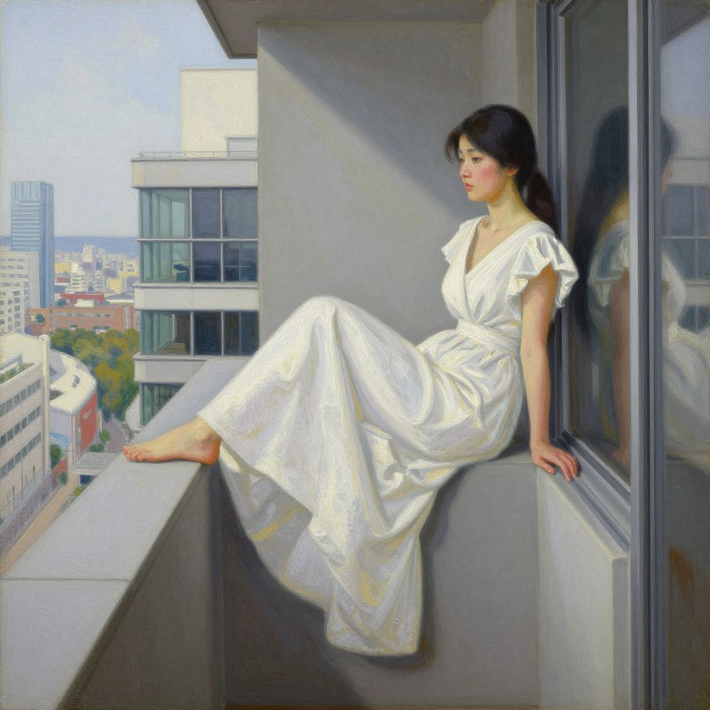 The image is a painting in the style of Jack Vettriano, featuring a Japanese woman with fair skin and sharp features, dressed in a flowing white dress, sitting on a balcony of a tall building. The woman's pose is dramatic, with one leg crossed over the other, and she gazes thoughtfully into the distance. The balcony is part of a modern architectural structure, with large windows and a sleek, minimalist design. The background reveals a cityscape with tall buildings, suggesting an urban setting, possibly Tokyo. The scene is bathed in soft, natural light, creating a serene and contemplative atmosphere. The overall composition is balanced, with the woman centrally positioned, and the cityscape providing a contrasting backdrop that emphasizes her presence. The textures in the painting are detailed, from the smooth fabric of the dress to the rough concrete of the balcony, adding depth and realism to the scene.