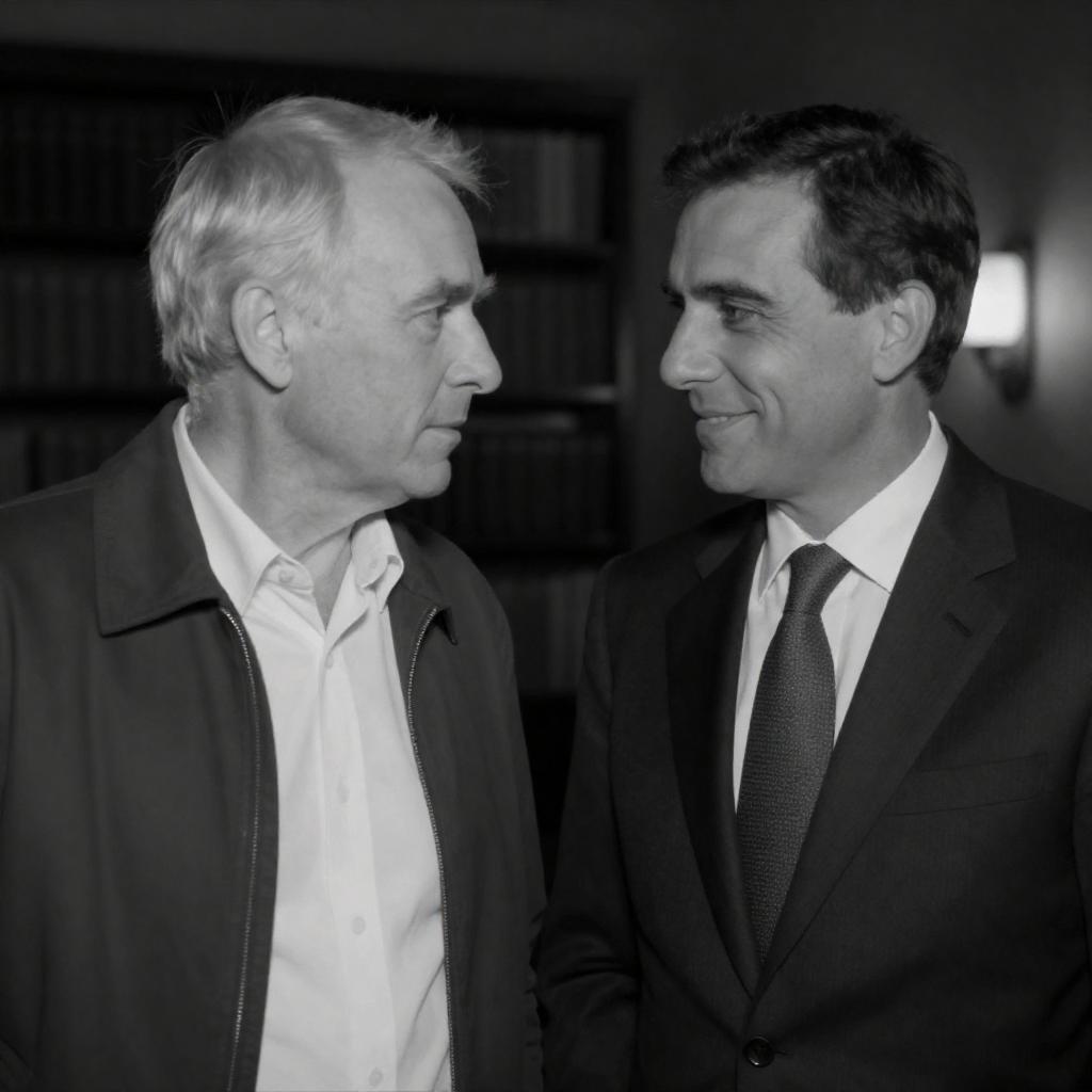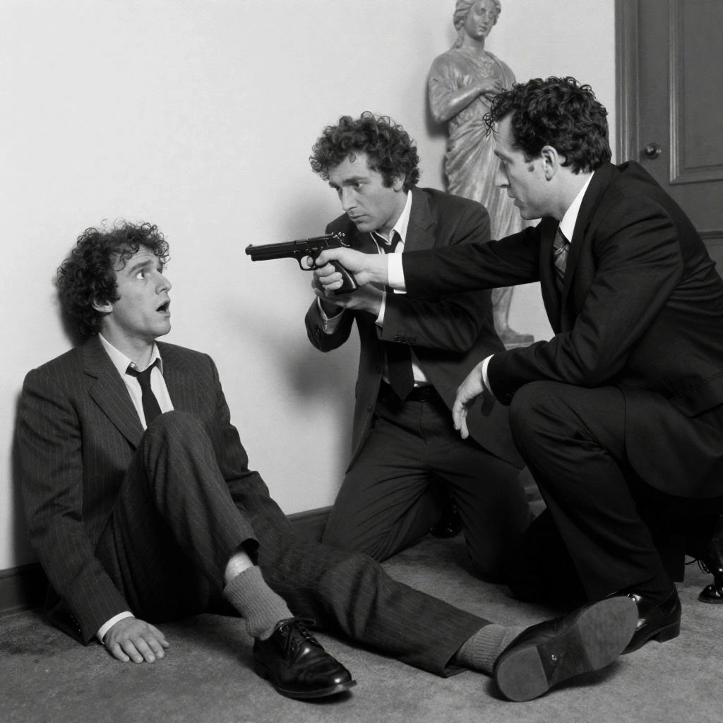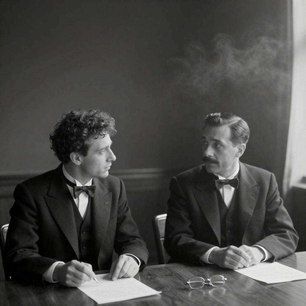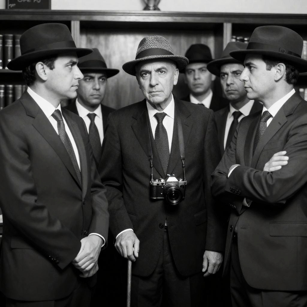 Black and white photograph of four men in suits. One man with curly white hair leans over, smiling, hugging the others. Two men with mustaches and glasses are on the left. One man with a hat is in the center. Tight huddle, intense expressions. Background is dark.