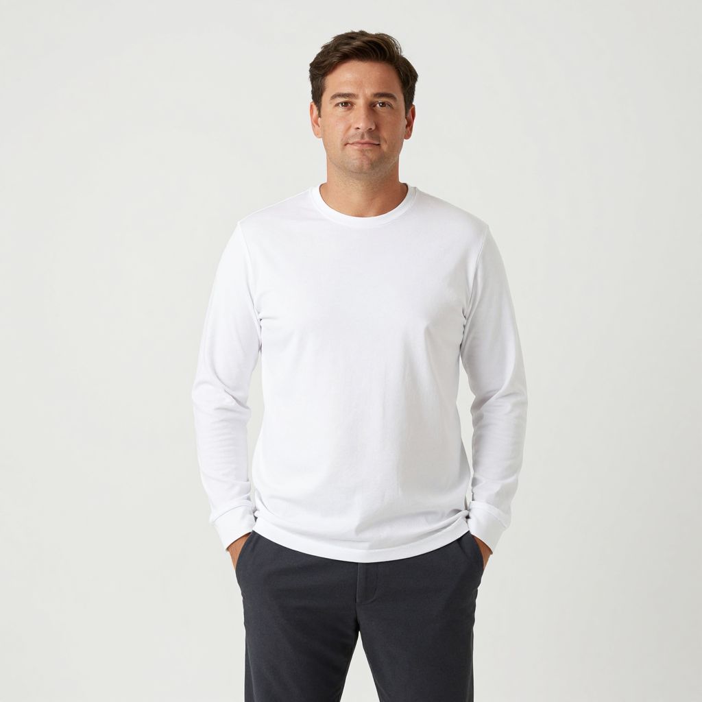 Photograph of a medium-built man with short, dark brown hair and light skin, standing against a plain white background. He is wearing a plain white long-sleeve shirt and dark navy blue pants with his hands casually in his pockets. His expression is neutral, with a slight smile. The image is brightly lit with even lighting, eliminating shadows. The man's physique is average, and he has a clean-shaven face. The overall style is minimalist, focusing on the subject without any additional props or background elements.