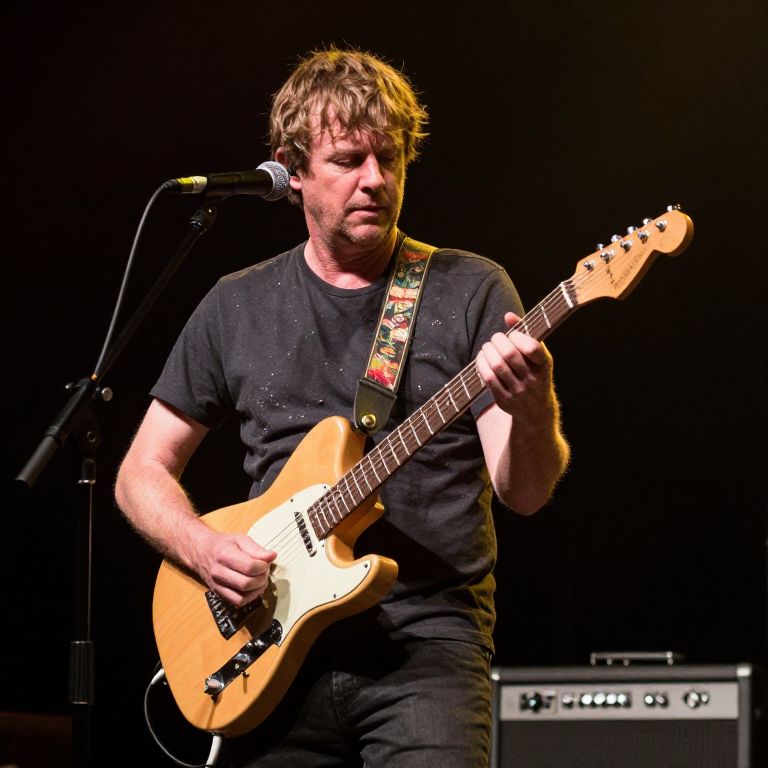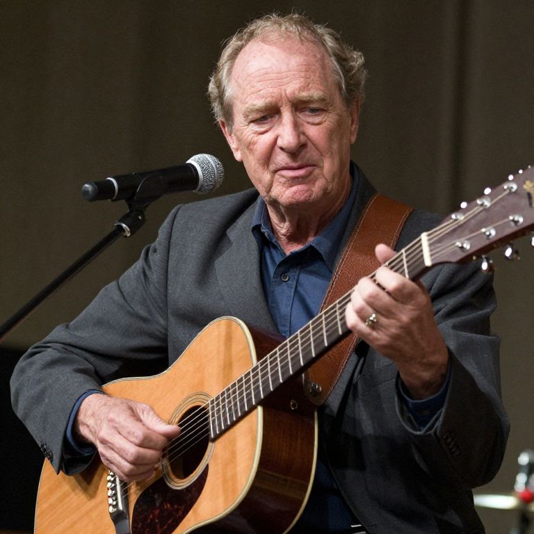 Photograph of an older white man with thinning, wavy gray hair, playing an acoustic guitar. He has a slightly rugged, weathered face with light wrinkles and is wearing a dark blue shirt under a black blazer. A microphone on a stand is positioned behind him. He is focused, with a gentle expression, and his right hand is strumming the guitar while his left hand plays chords. The background is dark, drawing attention to the subject. The guitar has a natural wood finish with a brown leather strap. The lighting highlights his face and the guitar, creating a warm, intimate atmosphere.