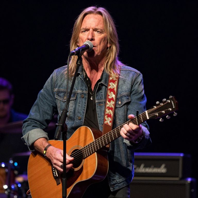 Middle-aged man with gray hair and beard, wearing a black jacket and blue shirt, passionately playing an acoustic guitar on stage.