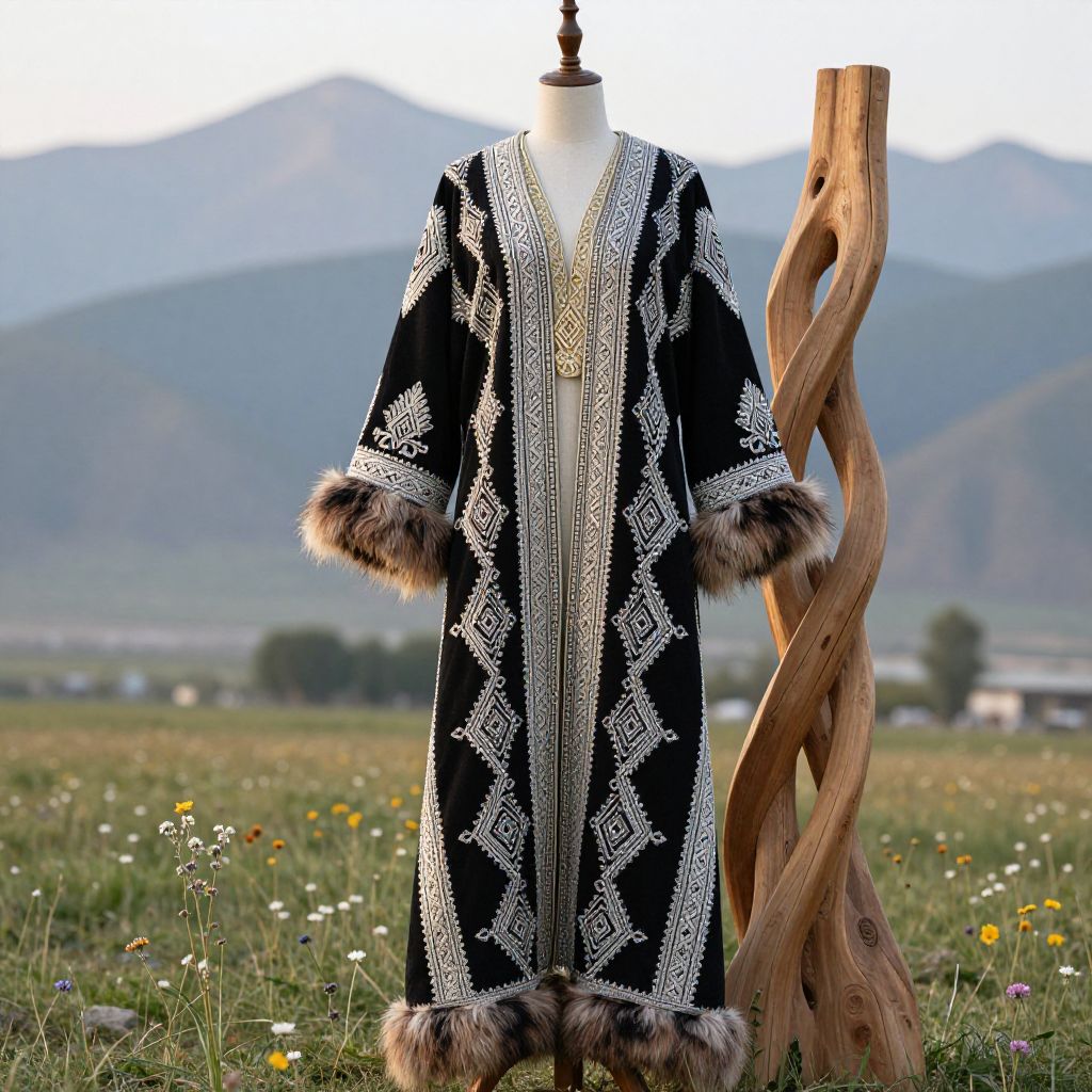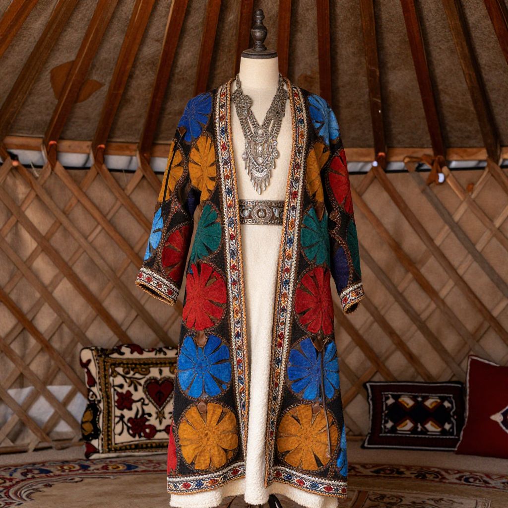 Kyrgyz dress traditional costume featuring colorful felt decorations and ornate silver jewelry, displayed on a mannequin in a sunlit yurt interior, warm earthy tones, authentic craftsmanship, natural textures of wool and leather, cultural and historical aesthetic