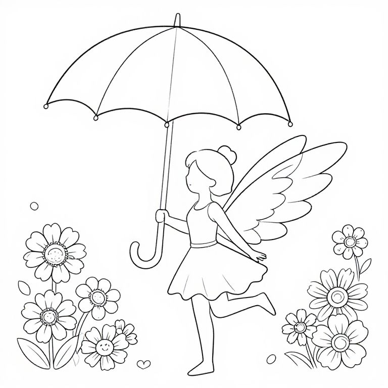 "Record coloring page illustration, fairy with large wings, holding a large umbrella, lots of flowers in the background, fairy elements,"