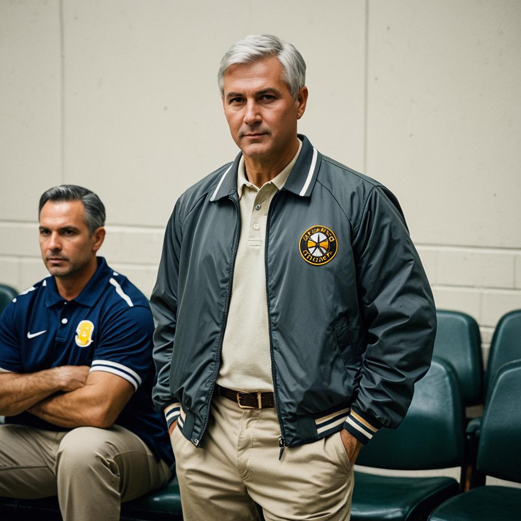 Coach cosplay, Hotshot Leon Russom, middle-aged man, short gray hair, vintage coach jacket, sports polo shirt, khaki pants, authoritative presence,
