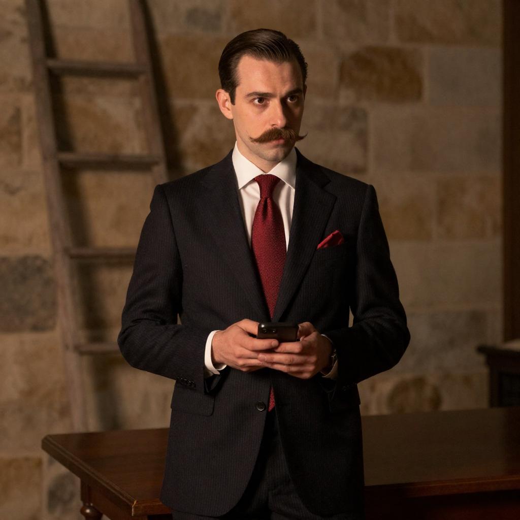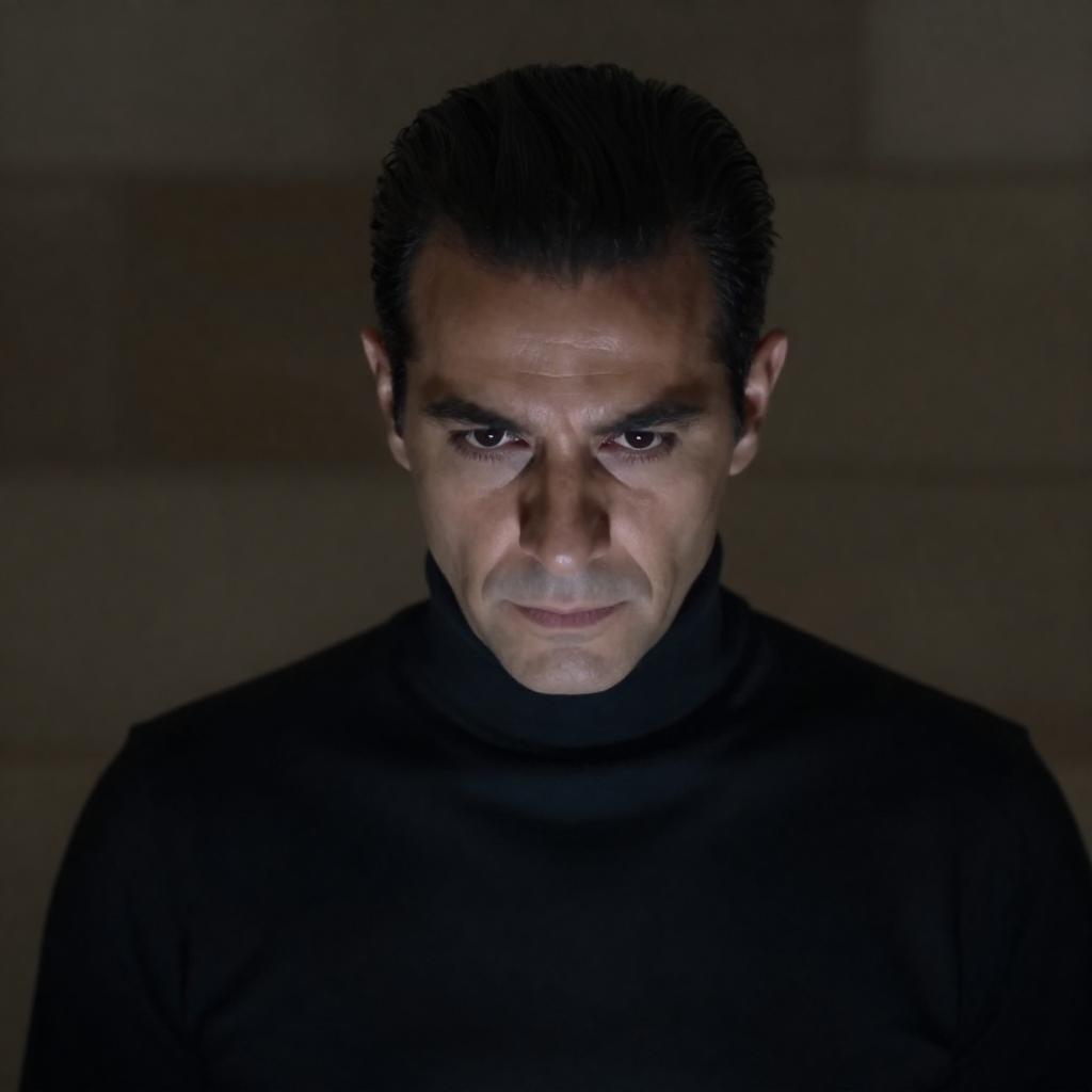 Middle-aged man with slicked-back hair, thick mustache, and intense gaze wearing a dark pinstripe suit and red tie. Red-lit background with a black cross and two lit candles. Man's face centered, candles and cross blurred in background.