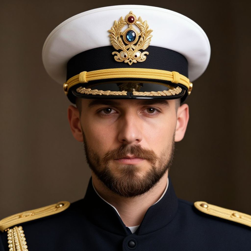 Captain stubing costume, 1boy, male focus, facial hair, solo, hat, uniform, military, military uniform, beard, realistic, mustache, manly, looking at viewer, peaked cap, jewelry, military hat, white headwear