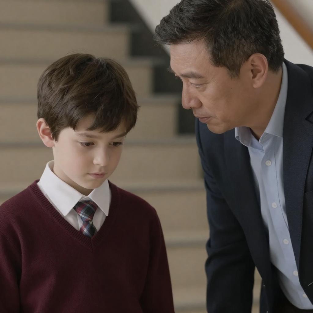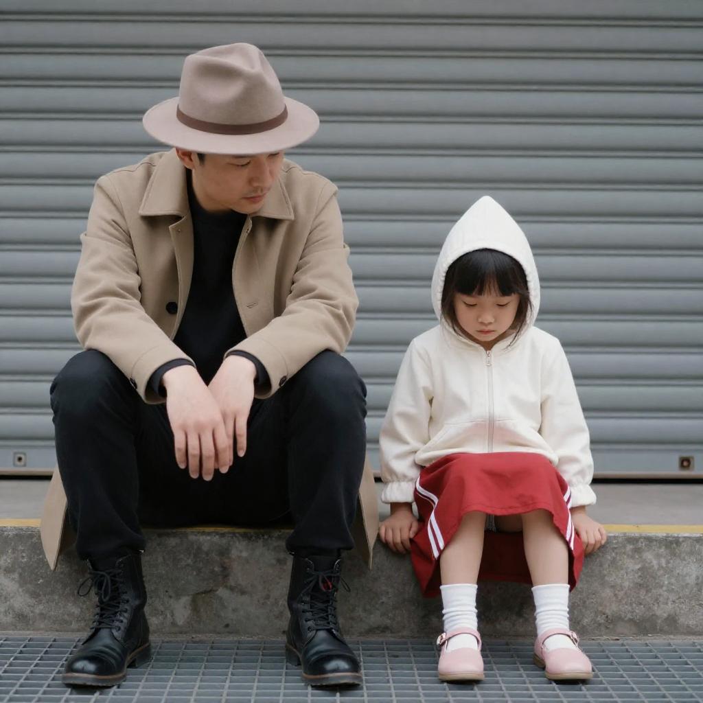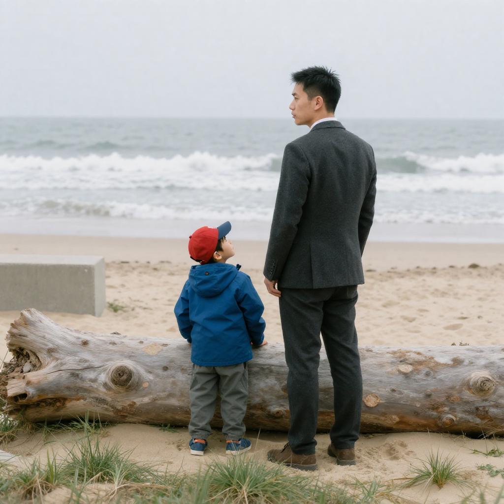 Photograph of a man and a child standing on a sandy beach. Man in dark suit, child in blue jacket and red hat, leaning against large weathered log. Ocean waves in background. Child looks up at man, man has neutral expression. Sandy beach with green grass in foreground. Log on right, concrete blocks on left. Both facing right.