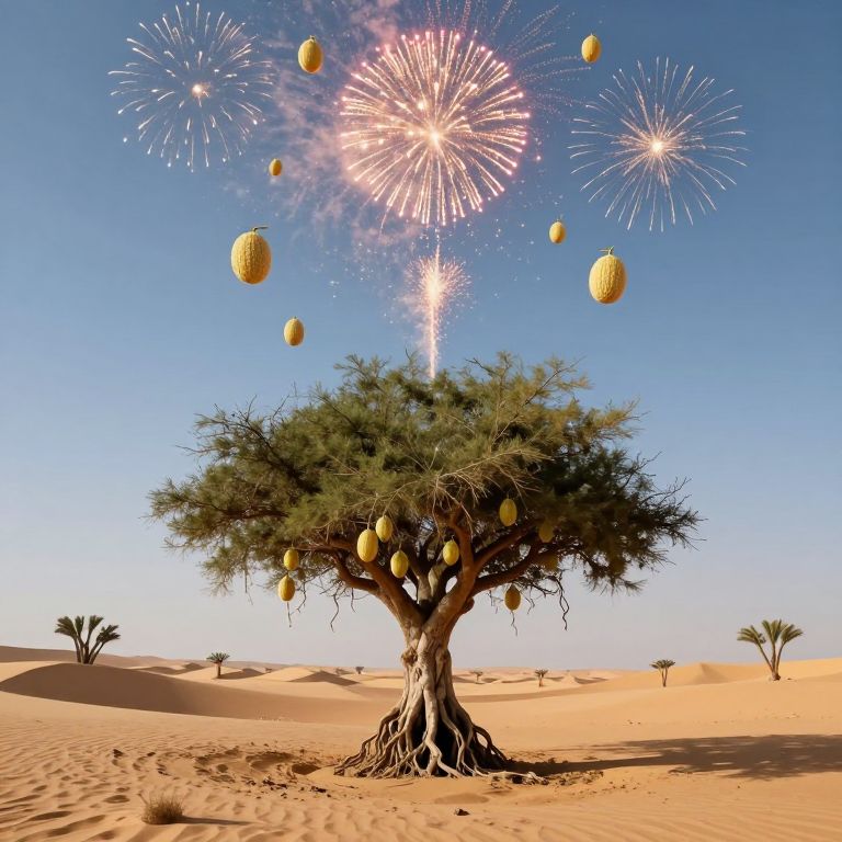 Photograph of a baobab tree in a desert, adorned with yellow fruits, under a vivid sky with colorful fireworks.