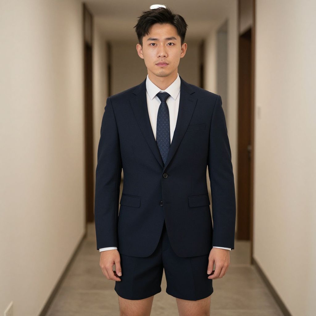 Photograph of an Asian man standing in a long, white-walled hallway with wooden doors on either side. He has short, black, slightly spiky hair and wears a black suit with a white dress shirt and a black tie. Notably, the suit is paired with black shorts, revealing his legs. He stands facing the camera with a neutral expression. The hallway has a clean, minimalist aesthetic, with smooth, gray concrete floors and bright, even lighting. The man's outfit and the image's composition create a humorous, unexpected contrast.