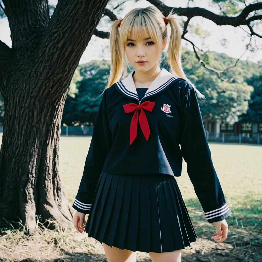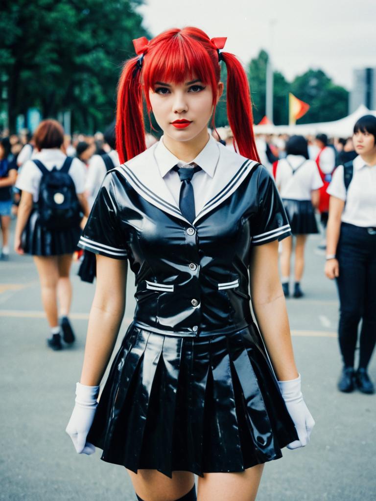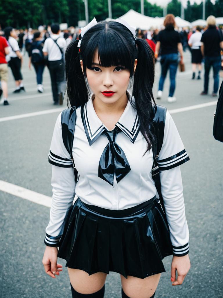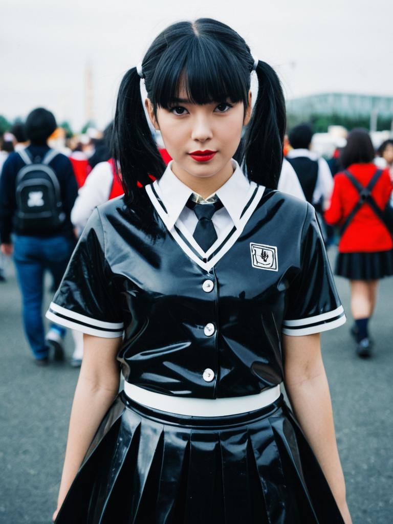 Woman in Latex Schoolgirl Costume, cosplay festival photo, photorealistic realism