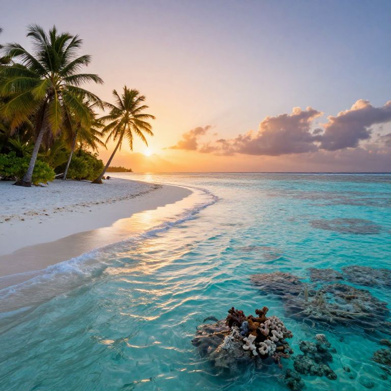 Cayo, a serene tropical island at sunset, palm trees swaying gently, crystal clear turquoise waters lapping against white sandy beaches, vibrant coral reefs visible beneath the surface, peaceful and untouched, cinematic lighting, ultra-realistic style