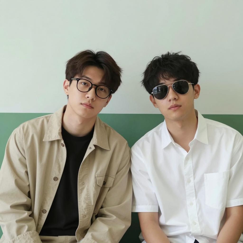 Two young men with short black hair, smiling, in a crowd. Left wears red shirt with white wing , right wears white shirt with brown patterned vest, throwing baseball. Blue sky background, other people with hats and sunglasses.