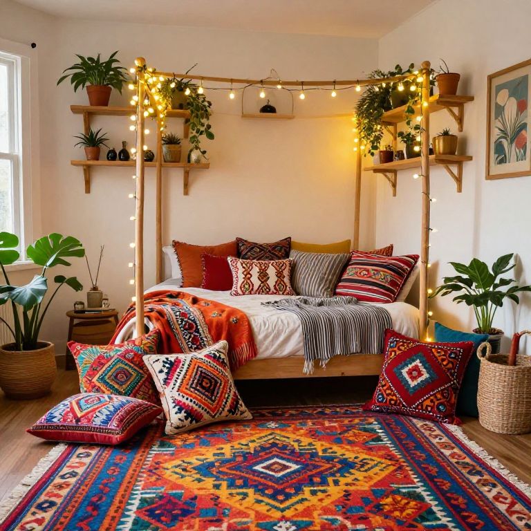 Cozy bohemian bedroom with colorful patterned pillows, string lights, wooden shelves, potted plants, and vibrant rug, illuminated by natural light