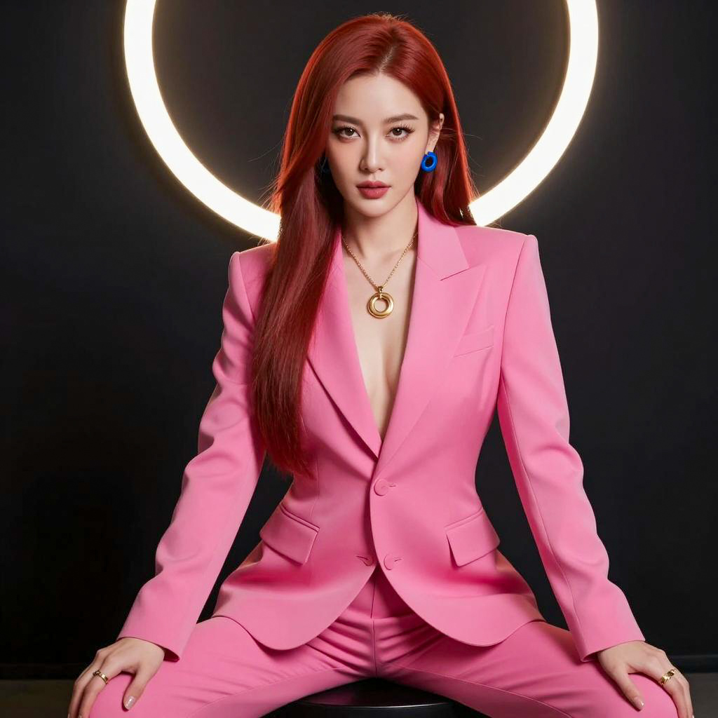 Portrait of a fashionable woman with fair skin and red lipstick wearing a turquoise suit with orange and blue vertical stripes. She accessorizes with a wide-brimmed turquoise hat featuring an orange ribbon and matching turquoise circular earrings. Her dark brown hair is neatly pulled back, and she poses confidently against a pink background with a red oval shape.
