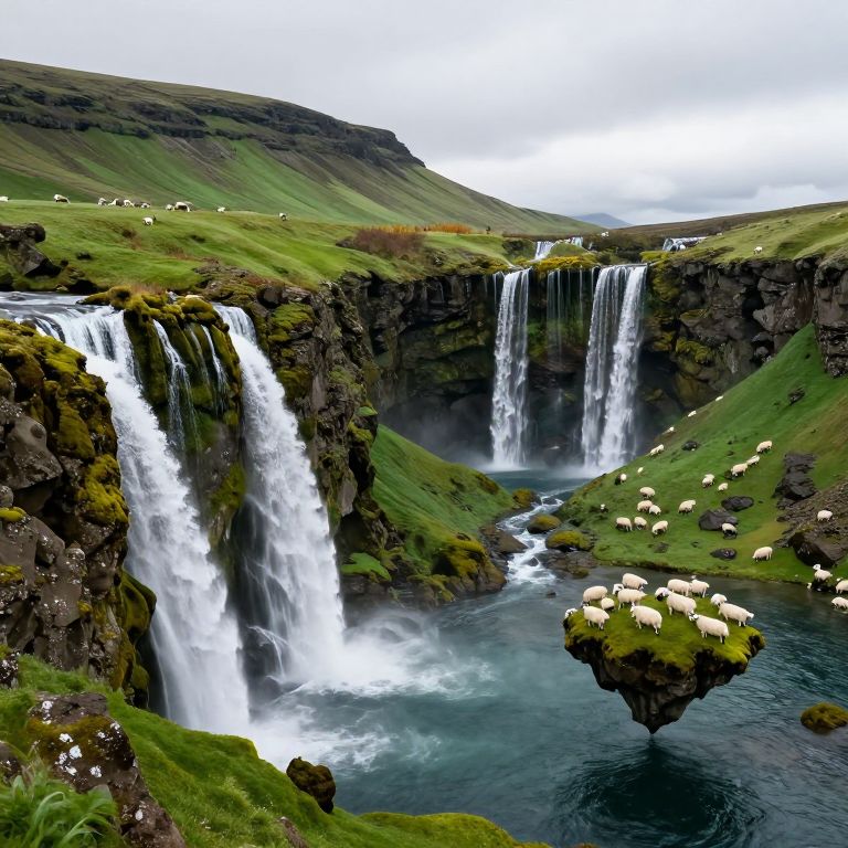 Photograph of a lush, green Icelandic landscape with cascading waterfalls, grazing sheep on mossy cliffs, and a cloudy sky.