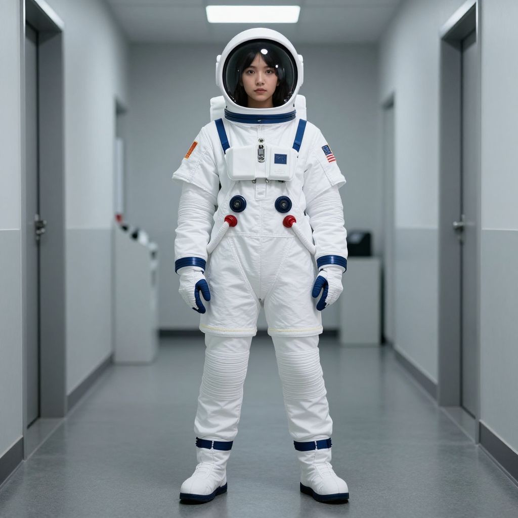 Girls Astronaut Costume, woman in a space suit standing in a hallway