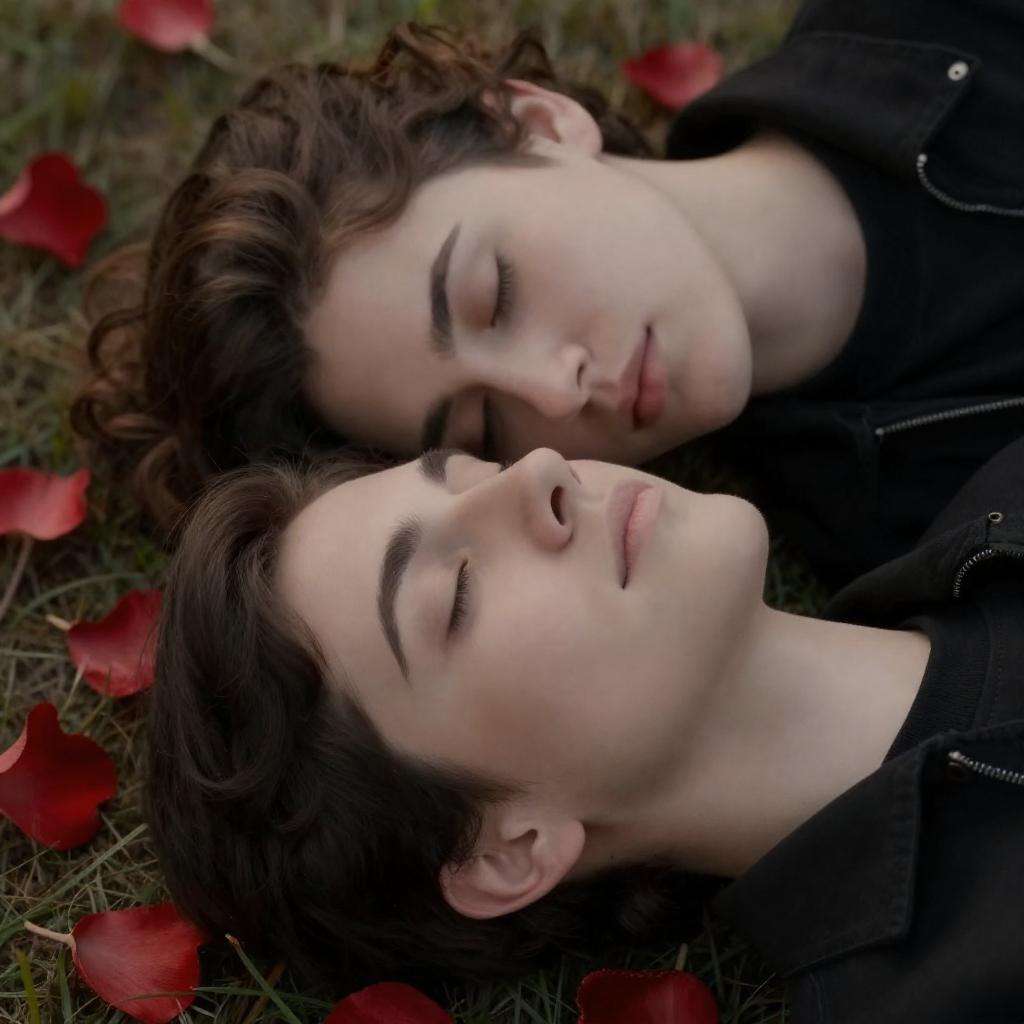 Close-up photo of two young individuals with closed eyes lying on grass scattered with red flower petals. The person on top has curly brown hair and is wearing a black jacket, while the person below has short dark hair and is also dressed in black. The image highlights their peaceful, relaxed expressions with a softly blurred natural background.