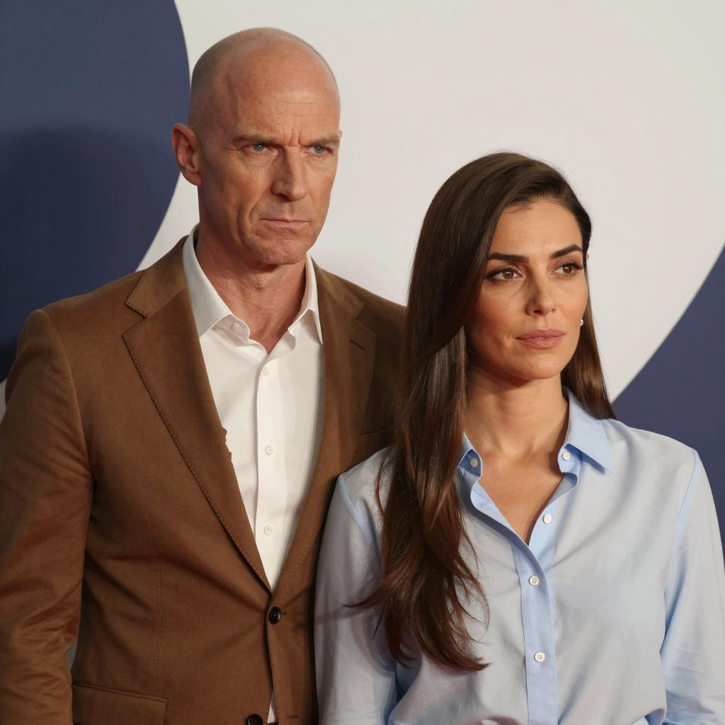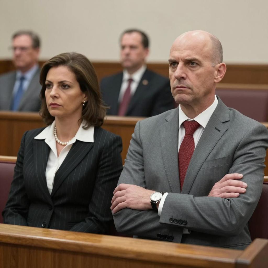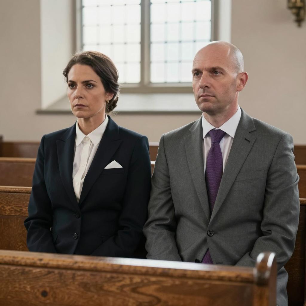 A photograph of a man and woman sitting side by side in a church. The woman with dark brown hair in an updo, wearing a black suit with a white collar and pocket square, has a serious expression. The bald man in a gray suit with a white shirt and purple tie, looks slightly to the side. Wooden pews are in the foreground, and a large, grid-patterned window is in the background.
