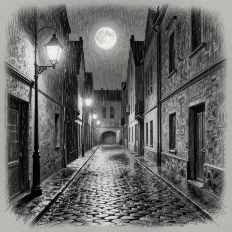 A surrealistic pencil sketch of a moonlit, rain-soaked alley with cobblestone pavement and tall buildings, illuminated by street lamps.