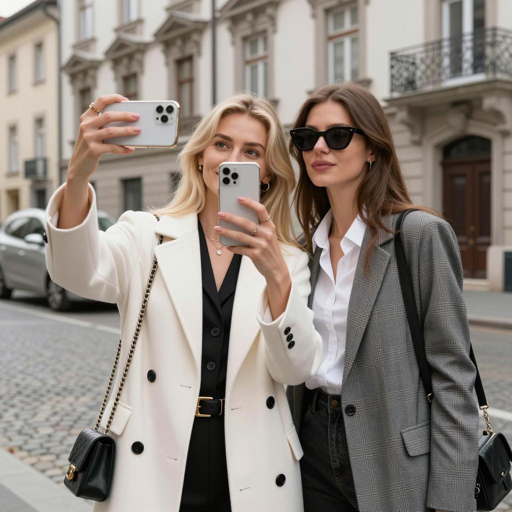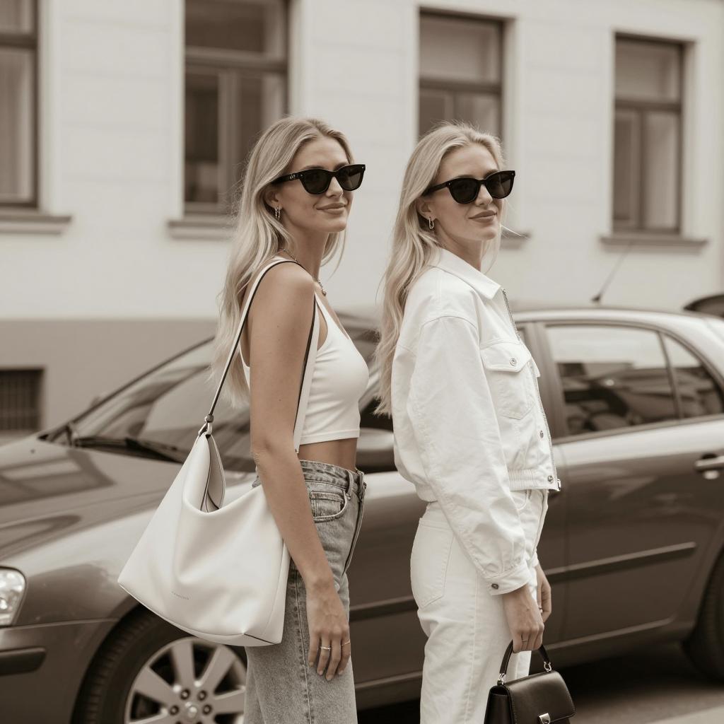 Two women walking outdoors. Left woman wears black blazer, pants, and sunglasses, holding a small gold handbag. Right woman wears white blazer and pants, black handbag, sunglasses, holding a phone. Both have long brown hair, wearing black shoes. Light gray ured wall in background. Sunlight casting shadows. Women smiling. Textured cobblestone pavement.
