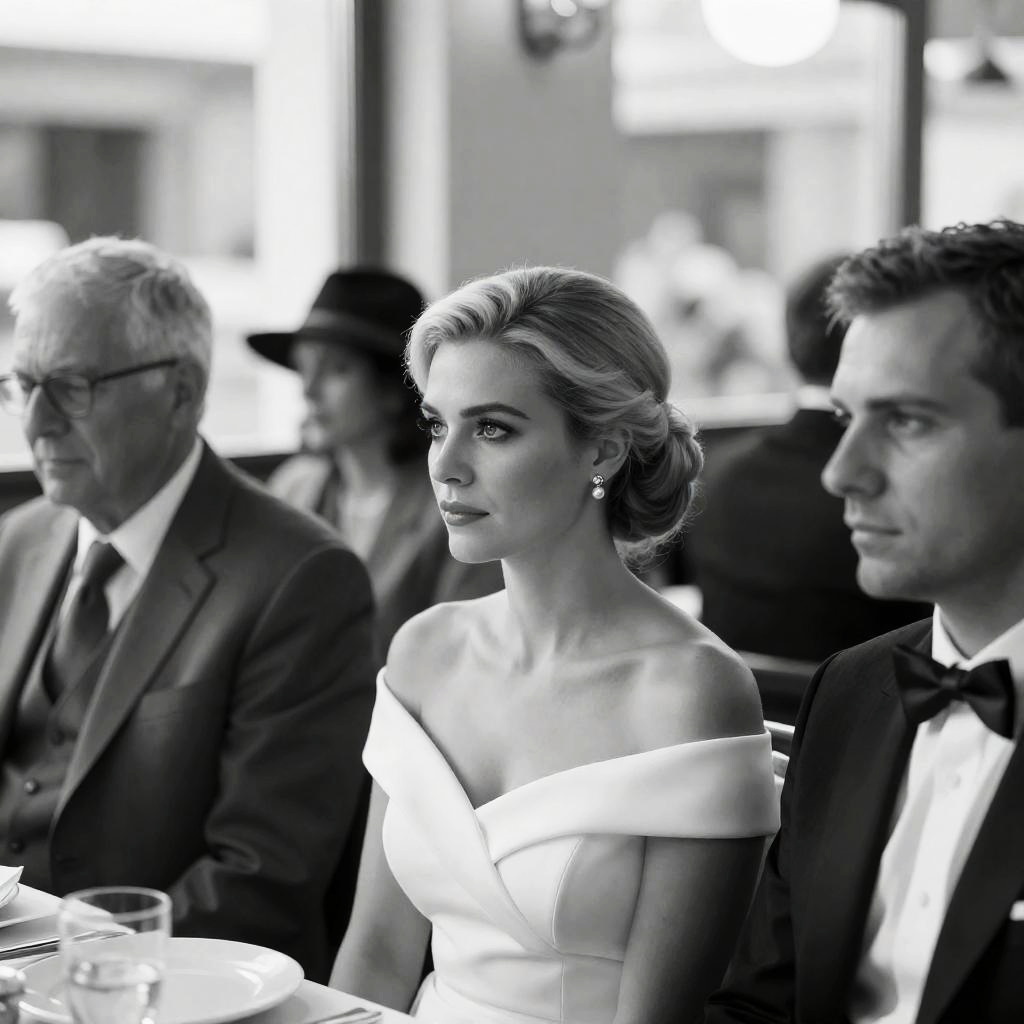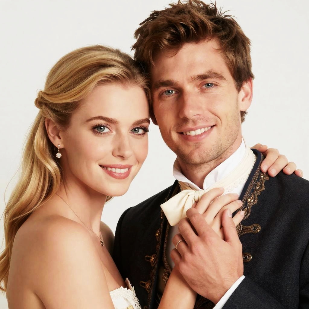 Photograph of a man and woman. Woman with blonde hair, lace dress, white hat with feathers, blue umbrella, looking at man. Man with blond hair, grey suit, white shirt, looking at woman. Both standing, woman holding umbrella. Outdoor setting. Woman's expression neutral, man's expression neutral. Background blurred.