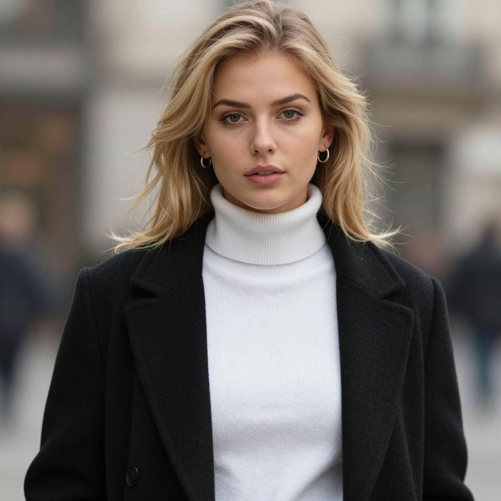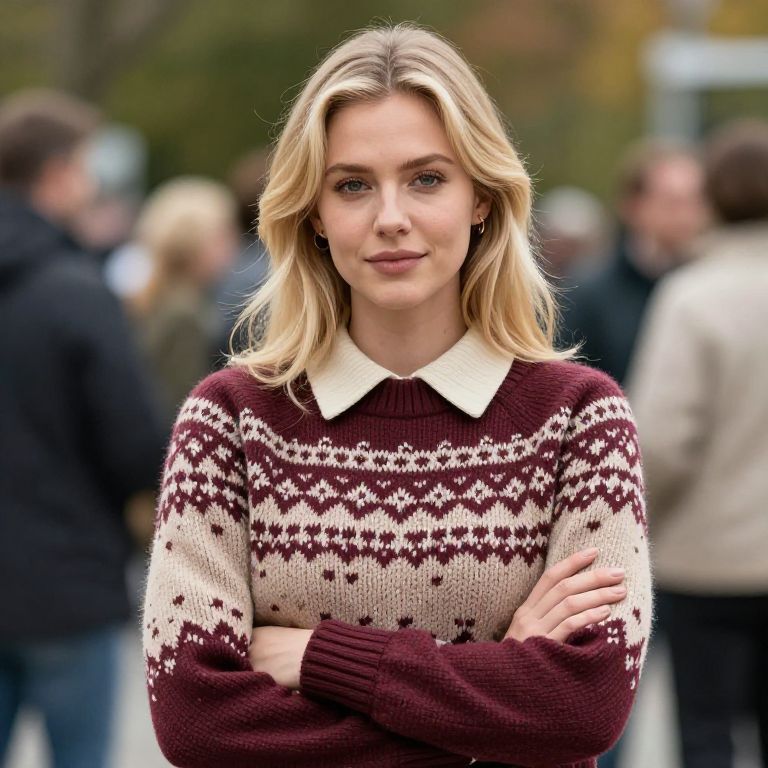 Female with blonde hair, wearing a maroon and beige sweater with a cream collar and a beige and brown pattern. She is standing with her arms crossed, looking at the camera. In the background, there are other people and trees.
