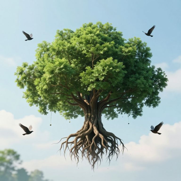 Photorealistic CGI image of a large, leafy green tree with a thick, gnarled trunk and exposed roots floating in a bright blue sky. Four blackbirds with outstretched wings are flying around the tree. The background is a clear, slightly cloudy sky, creating a serene, airy atmosphere. The tree's detailed texture contrasts with the smooth sky, highlighting the tree's natural beauty and the birds' dynamic movement. The image has a realistic, almost magical quality.