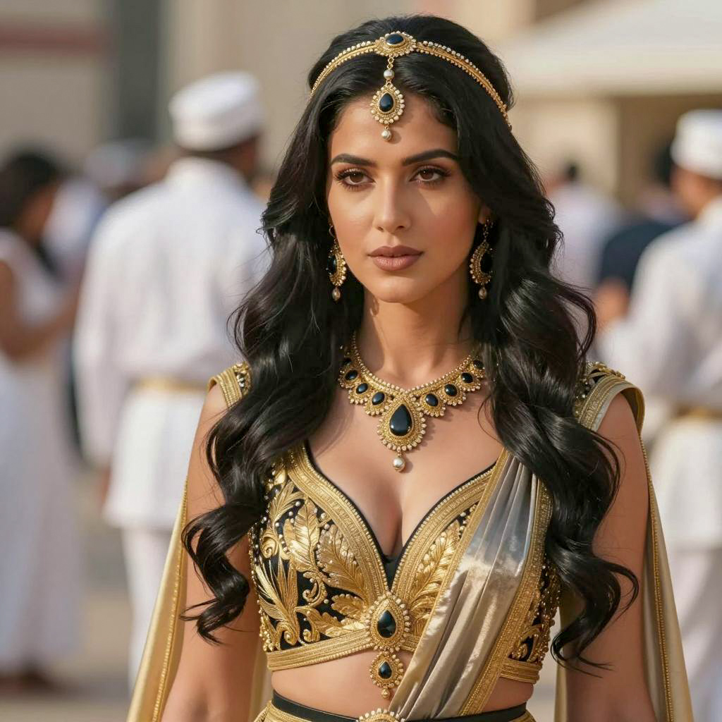 Three women in a cave. Central woman in black bikini, gold headpiece, snake draped over chest, arms outstretched. Woman in red robe in background. Bright orange firelight outlines cave entrance. Second woman partially visible behind central figure. Intense expressions. Brown rocky cave walls with carvings.