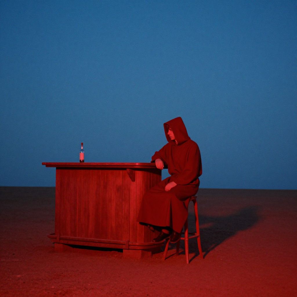 Photograph of a solitary figure seated at a wooden bar table in a barren, desert-like setting under a vivid blue sky. The person, dressed in a long, hooded red robe, is illuminated by a red light, casting a dramatic, eerie glow. The individual's face is partially obscured by the hood, and they have one arm resting on the table. A single bottle of red liquid, possibly wine, is placed on the table's left side. The red light highlights the texture of the wooden table and chair, creating sharp contrasts against the blue sky and red-tinted ground.