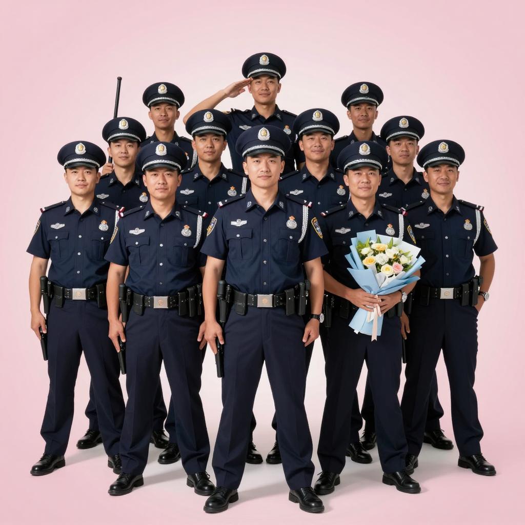 Group photograph of 15 police officers in blue uniforms, hats, and badges. Officers stand in three rows, smiling, with some holding guns, batons, and a bouquet. Background is a soft pink gradient. Officer in front center raises arm with gun. Officer in back center salutes. Officer on far left holds baton, and one on far right holds bouquet.