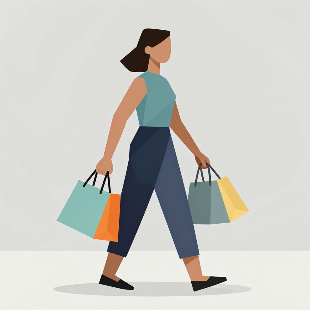 Digital illustration of a woman with brown hair in a ponytail, wearing a sleeveless blue top and navy pants, walking while carrying two shopping bagsāone