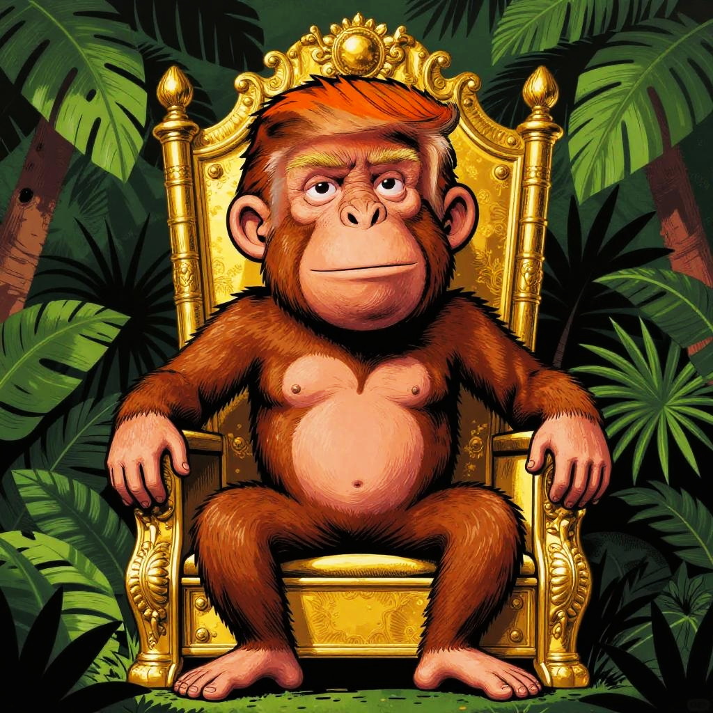 Trump monkey character design, caricature style with big mouth and orange hair, sitting on a golden throne amidst tropical trees, bold lines and vibrant contrast, satirical political commentary
