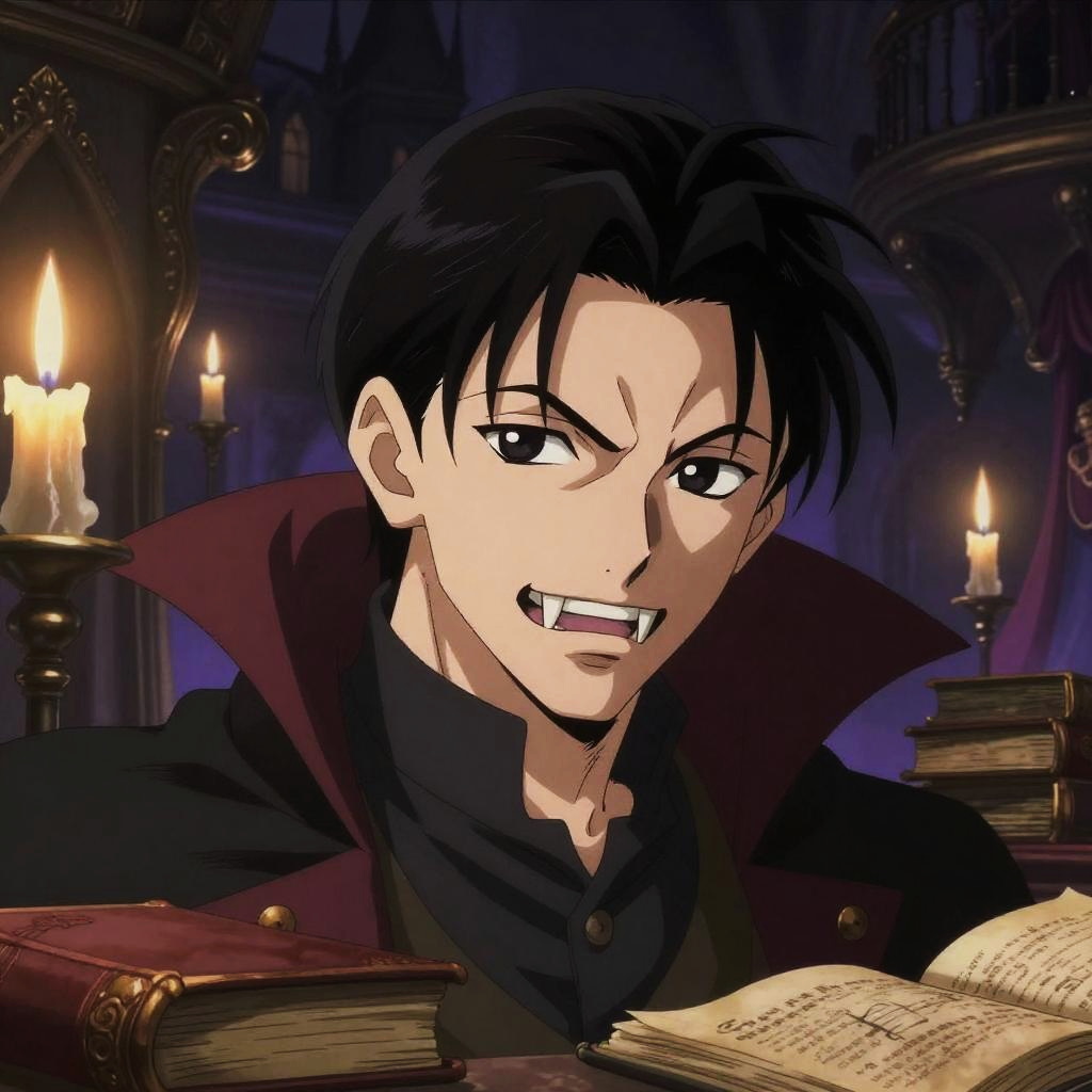 Vampire anime boy with fangs in a classic haunted mansion, surrounded by floating candles and ancient books, dark hair slicked back, intense gaze, richly detailed anime illustration