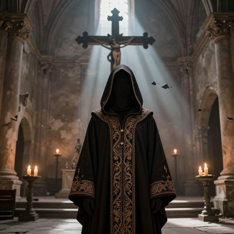 A hooded figure in a dark, intricately embroidered robe stands amidst the ruins of an old church, with a destroyed cross in the background, candles burning, and rays of light filtering through cracks in the walls.