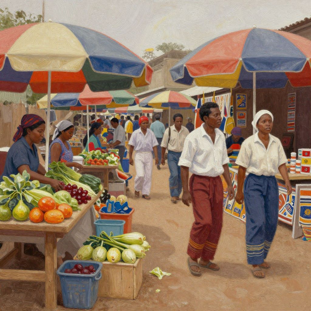 Jacotey bustling market scene with villagers trading fresh produce under colorful umbrellas, traditional costumes, lively cultural expressions, vibrant setting with wooden stalls and handmade crafts, textured brush strokes in warm tones
