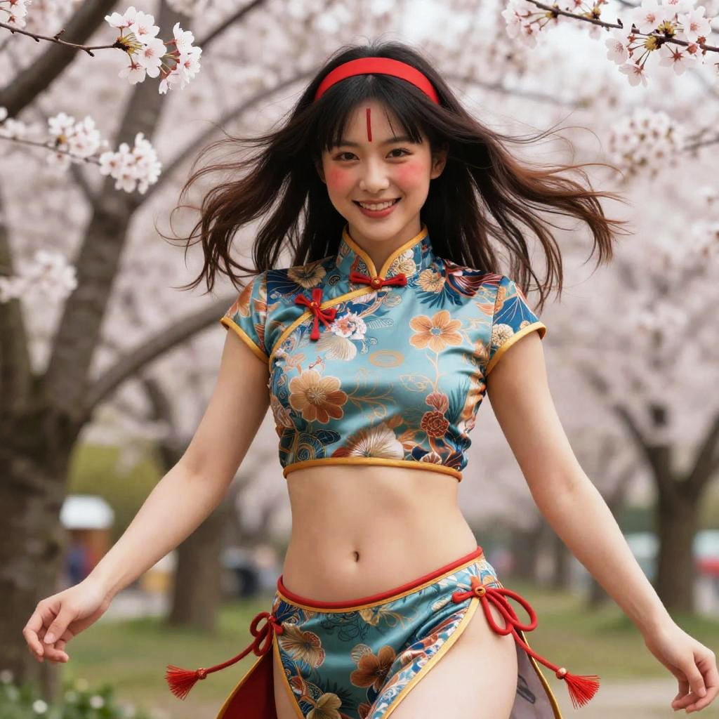 Photograph of a smiling Asian woman with fair skin and dark, shoulder-length hair, wearing a blue and gold floral-patterned cheongsam with red trim and red headband. She is mid-motion, with her arms slightly raised, revealing her toned midriff. The cheongsam has short sleeves and a high collar, paired with matching high-waisted shorts tied with red strings. She stands in a park with blooming cherry blossom trees in the background, creating a soft, pinkish blur. The bright daylight enhances the vibrant colors of her outfit and the natural setting.