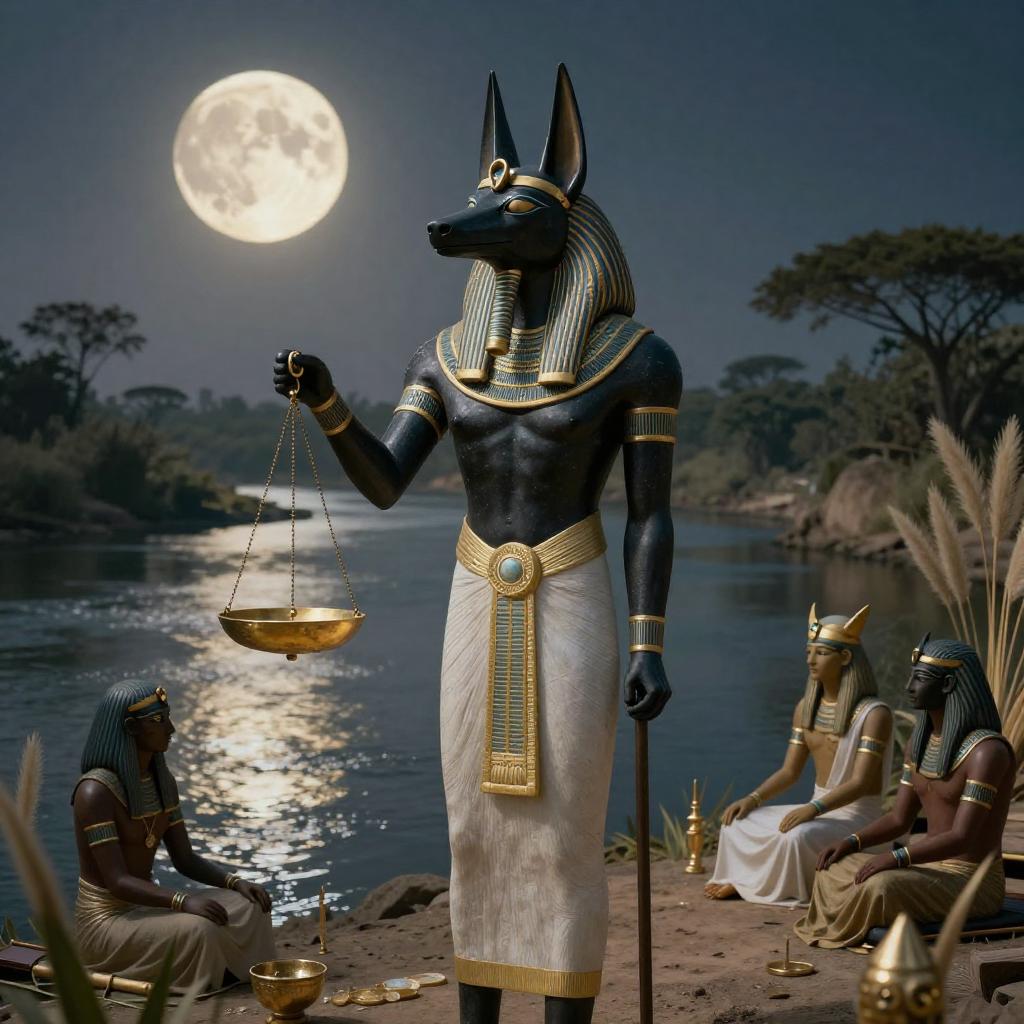 Statue of Anubis, the ancient Egyptian god of mummification and the dead, depicted with a jackal head and human body, holding golden scales. The scene is set at night on a riverbank illuminated by a full moon, surrounded by figures representing spirits gathering for judgment. Papyrus plants and Egyptian attire enhance the authentic ancient Egypt atmosphere.