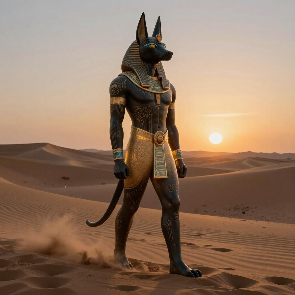 Anubis – God of mummification and the dead, shown as a guardian figure emanating an aura of calm authority, his visage serene while clutching golden scales, set in a moonlit riverbank lined with papyrus, where spirits gather for judgment.