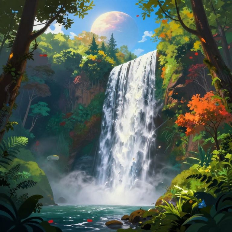 A vibrant, ultra-detailed digital painting depicts a fantastical waterfall in a lush, colorful forest, with a bright, magical glow and a hazy planet in the sky, creating an epic and immersive scene.