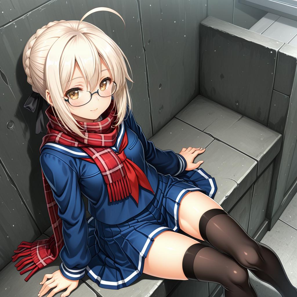 Digital anime-style drawing of a blonde girl with glasses and a red plaid scarf, sitting on gray concrete steps. She wears a blue sailor-style school uniform with white trim, a short blue skirt, and black thigh-high stockings. Her hair is styled in a neat bun with a few loose strands, and she has a gentle smile. The background consists of gray, textured concrete walls. The lighting is soft, highlighting her fair skin and the vivid colors of her outfit. The overall mood is calm and slightly melancholic.