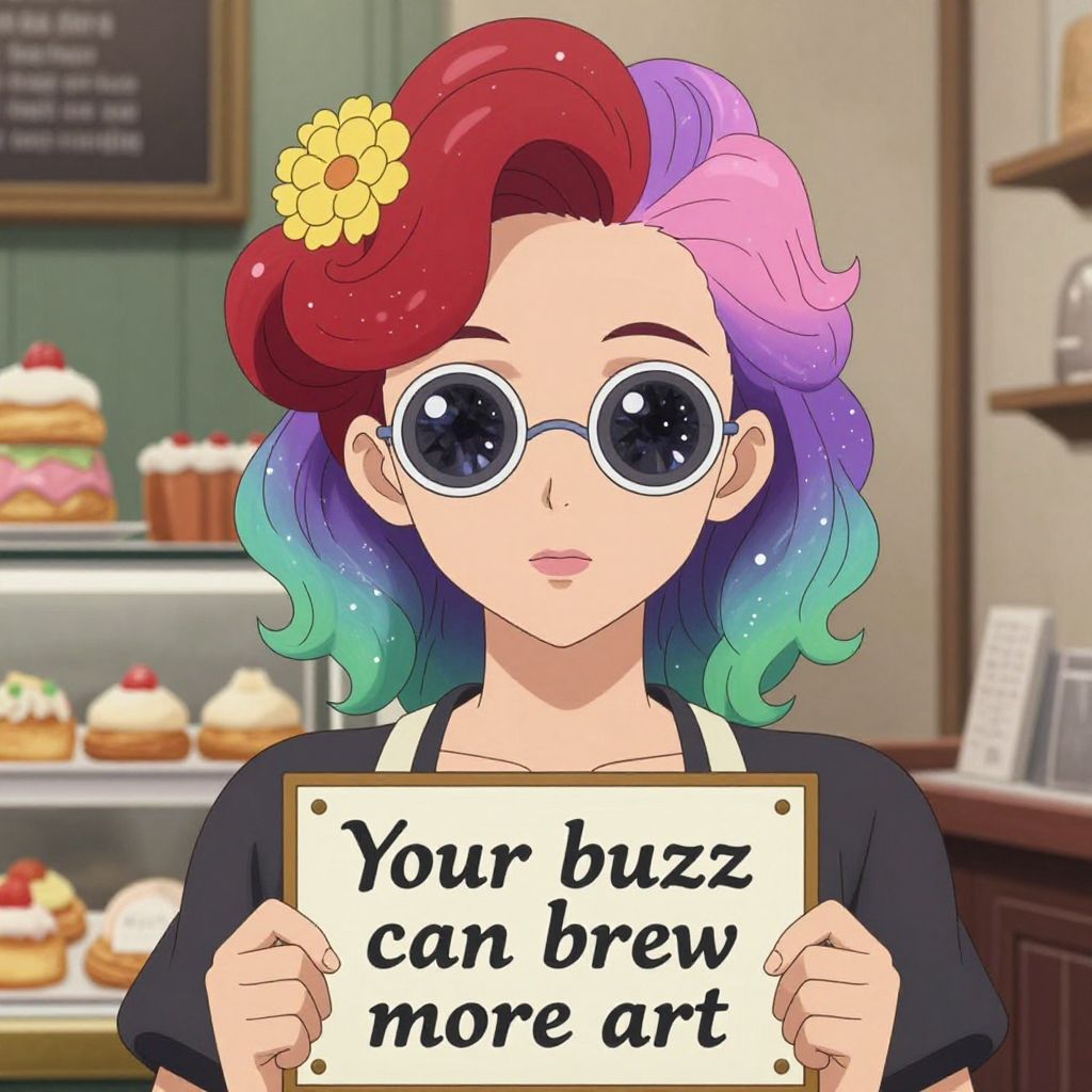 Setting: a charming vintage vibes café with colorful pastries displayed, Character: A stylish barista with a vintage apron, holding a sign that says, “Your buzz can brew more art\" Soft Anime Close-up Appearance Elements: round circle contact lenses, dark crystal pupils, symmetrical elysium, stereogram, closed mouth, lips, chin, nose, mature woman, flower power Hairstyles: half-up half-down Styling Elements: whimsical, galaxy, soft-shaded, pastel, realistic Colors: red, purple, pink, green, teal