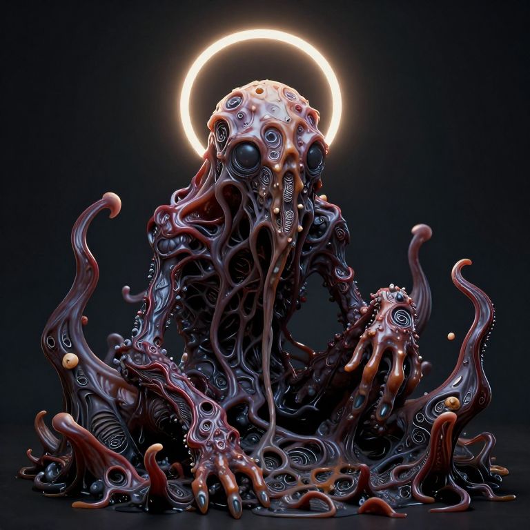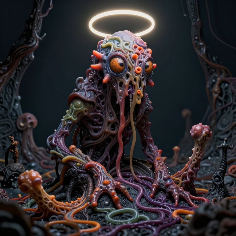 Dark fantasy, slimy, unusual color, doodles, hybrid creature, halo, glow, limited dark color palette, vividly detailed, microscopically detailed, professional photo but beautiful, hyper realistic and highly, dramatic light, by Steve McCurry, by Rembrandt, by Kerby Rosanes