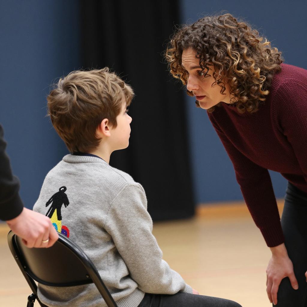 A young boy with light brown hair and a gray sweater with a black and colorful design on the back, sitting in a chair. A woman with curly brown hair and a maroon knitted top leans forward, looking at him. An adult's arm with a ring is partially visible on the left. Background includes blue walls, a dark curtain, and a wooden floor.
