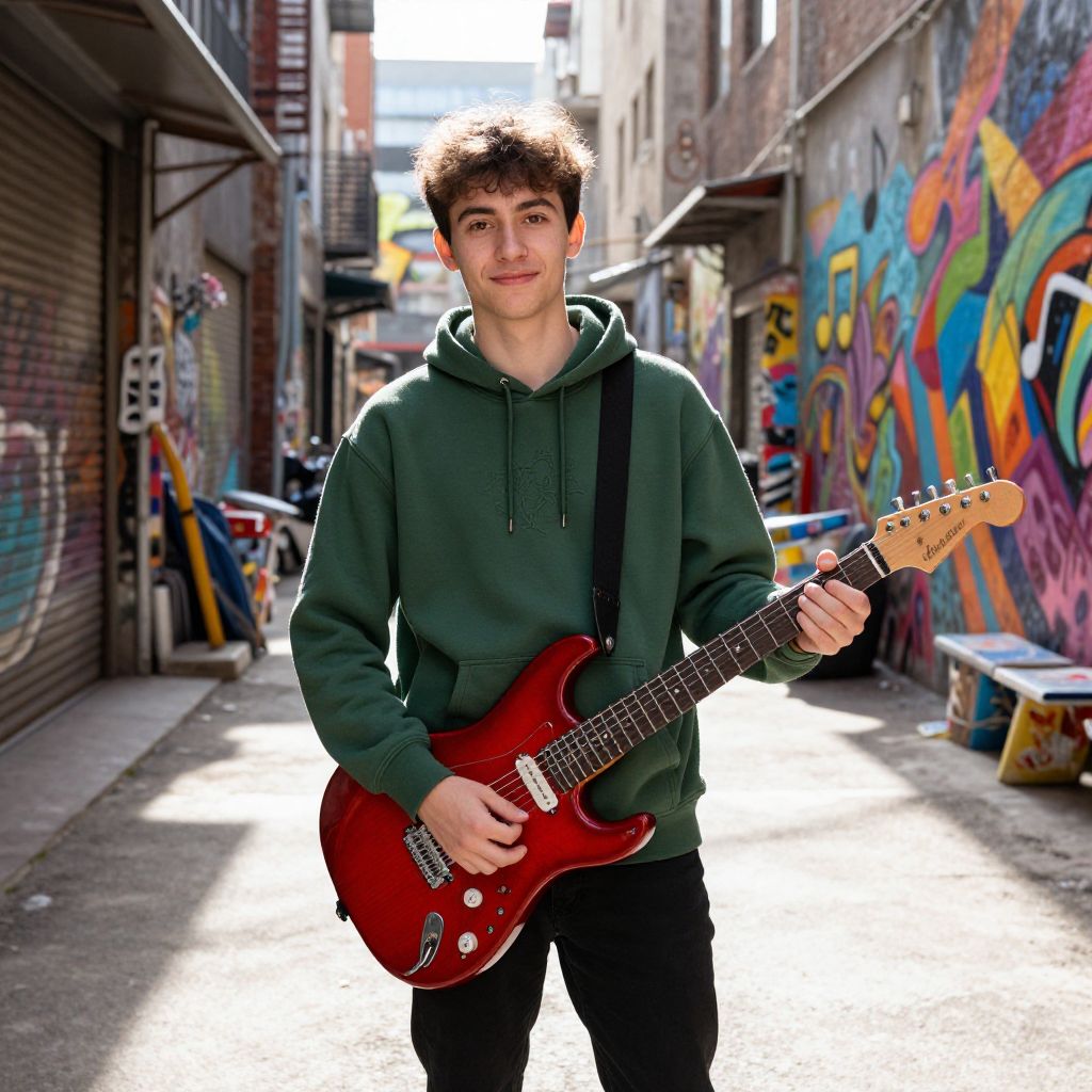 A young man with short brown hair, warm brown eyes, and a friendly, relaxed expression stands in a sunlit urban alley, wearing a green hoodie with a subtle band logo and black pants. He is holding a bright red electric guitar with a polished, shiny finish, its strings slightly gleaming in the sunlight. The alley is lined with vibrant graffiti walls, painted with bold, colorful murals of music notes and city life. Sunlight streams through the narrow space, casting soft, long shadows on the concrete floor, creating a lively and energetic atmosphere. The scene exudes a sense of freedom, creativity, and urban vitality, with a mix of street art and music culture in the background.