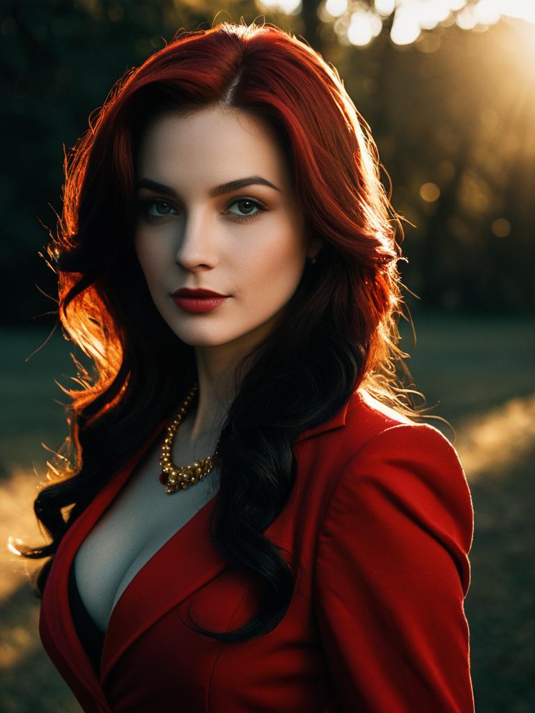 Sexy cosplay woman character wearing Madam Red (Angelina Durless) costume. Realistic photo. Jane Doe dressed as Madam Red (Angelina Durless) --sref 1393