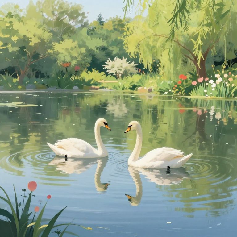 Digital illustration of two white swans with orange beaks, gently floating in a serene, reflective pond surrounded by lush greenery and colorful flowers under a