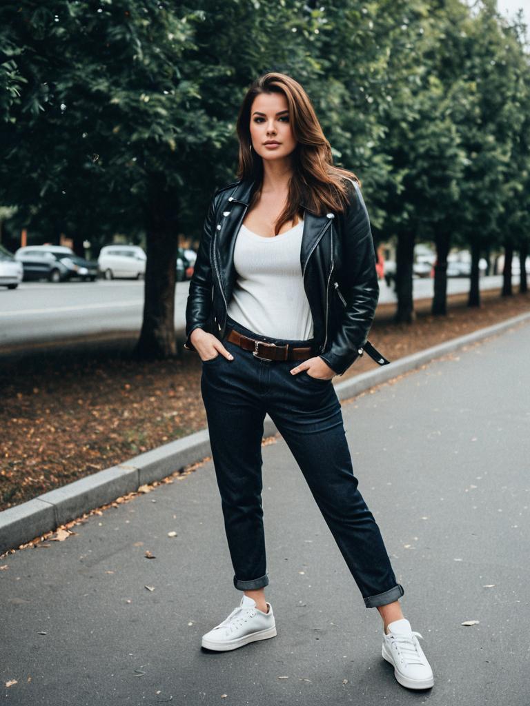 Stylish pants woman costume, 1girl, solo, pants, jacket, brown hair, hands in pockets, long hair, belt, sneakers, breasts, realistic, black jacket, black pants, outdoors, shoes, denim, full body, shirt, medium breasts, white footwear, open jacket, day, cleavage, leather jacket, standing