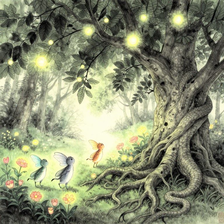 Craft an image that harmoniously merges the intricate ink drawing technique with ethereal landscapes, portraying a tranquil forest clearing where enchanting, fantastical beings frolic among radiant, glowing flowers dancing in the soft breeze. Capture this whimsical scene from a low vantage point, gazing upwards at an age-old tree whose roots coil and weave like serpents beneath the earth, its limbs adorned with luminous spheres. The lighting should imbue the atmosphere with magic, casting playful shadows through the leaves while illuminating the minute details on the creatures' wings and fur, blending natural splendor with fantastical elements to create a captivating, immersive visual narrative.